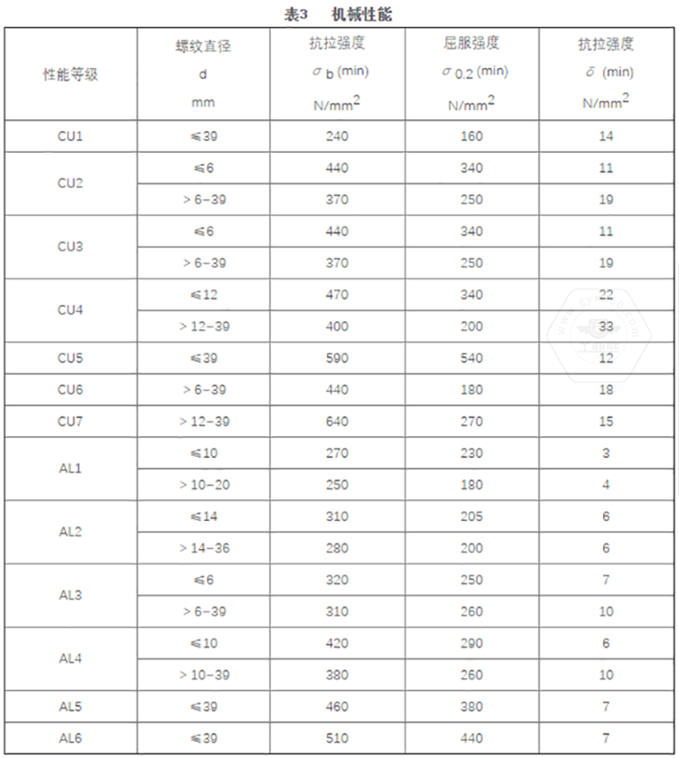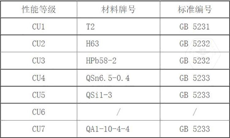 GB/T 3098.10標(biāo)準(zhǔn)中將銅制緊固件分為7個(gè)性能等級(jí),標(biāo)記代號(hào)由字母及數(shù)字兩部分組成,即有色金屬化學(xué)元素字母加數(shù)字。其性能等級(jí)為CU1、CU2、CU3、CU4、CU5、CU6、CU7。標(biāo)準(zhǔn)中同時(shí)推薦了對應(yīng)性能等級(jí)選用的銅材料牌號(hào)。