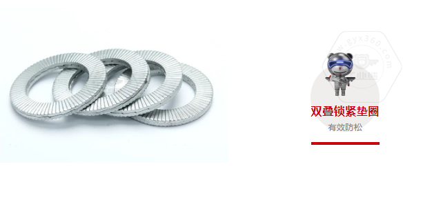 特點(diǎn):雙疊鎖緊墊圈適用于振動(dòng)劇烈的場(chǎng)合,通過楔形防松原理,可以起到有效的防松作用。